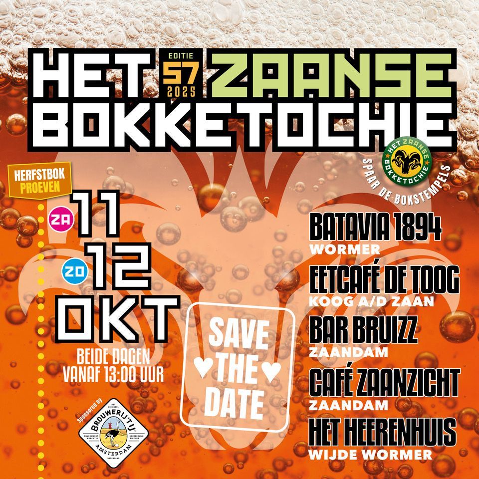 De 56e editie van het Zaanse Bokketochie vindt plaats op zaterdag 11 en zondag 12 oktober 2025. Tijdens dit evenement fietsen deelnemers langs diverse cafés in de Zaanstreek om bokbieren te proeven. Deelnemende cafés zijn onder andere Café Zaanzicht, Eetcafé De Toog, Bar Bruizz, Grand Café Batavia 1894 en Het Heerenhuis. Bij elk café kunnen deelnemers een stempel verzamelen op een speciale kaart. Een volle stempelkaart levert een aandenken op.